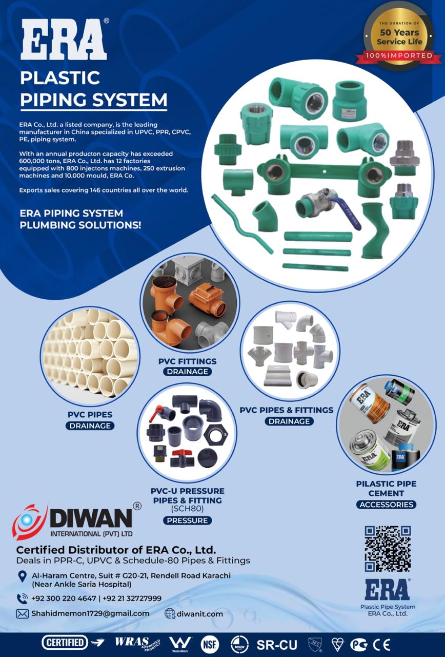 Diwan International is an authorized distributor of ERA Piping Systems in Pakistan, supplying high-quality PPR-C, UPVC, and PVC piping solutions. ERA products are globally recognized for their durability, performance, and compliance with international standards, making them a trusted choice for modern plumbing and infrastructure projects across the country.